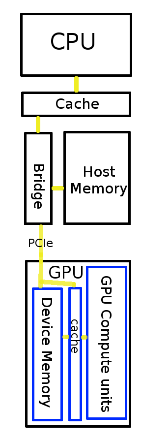 Copying a block of memory to the GPU takes a lot of time, since the PCIe’ bus-speed is limited to 8 GB/s (64 Gb/s). Now you say that DDR3 is not more than twice as fast as that, you have to know all the data has to via the CPU and thus the actual speed is of the PCIe is 4GB/s. Also there is no possibility for CPU-extras such as caching – although I haven’t found clues that support the idea that OpenCL for Intel uses CPU-caching directly. You also see a lot of benchmarks of OpenCL both with and without transfer-times, like this one on Bealto where around one eighth part is consumed by transferring data.