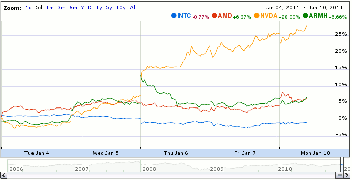 So NVIDIA is now surrounded by many competitors, who have access to ARM’s Mali-design [6]. For people not familiar with ARM, it might be a field only for the big boys of the PC-hardware-market; ARM is a huge sector. What we can see below (Intel, AMD, NVIDIA, ARM) is that the project is well-rewarded by investors [7]. Here Intel is the loser of both December and CES, while SandyBridge is very promising. AMD is a good second, even with no Fusion-chips on the market. ARM doesn’t seem to make big jumps, but grows steadily.
