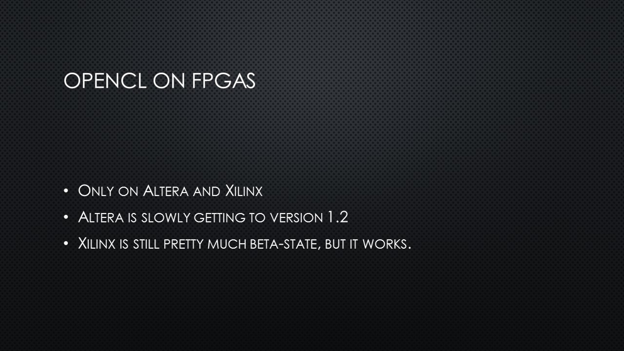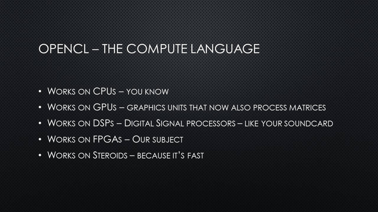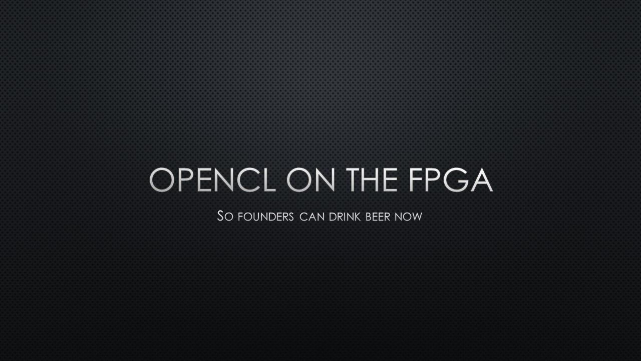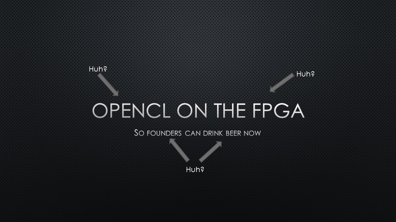 What do you do when you want to explain OpenCL and FPGAs and OpenCL-on-FPGAs to a beer drinking crowd in just 15 minutes? Well, you simply can’t go deep into the matter. On a Thursday evening, 5 November 2015, I was standing on a chair for a beer-loving group of Hackers and Founders with my laser-powered presenter, trying not to loose everybody. It was not the first time I stood on that particular chair – some years ago I presented about OpenCL-on-GPUs.