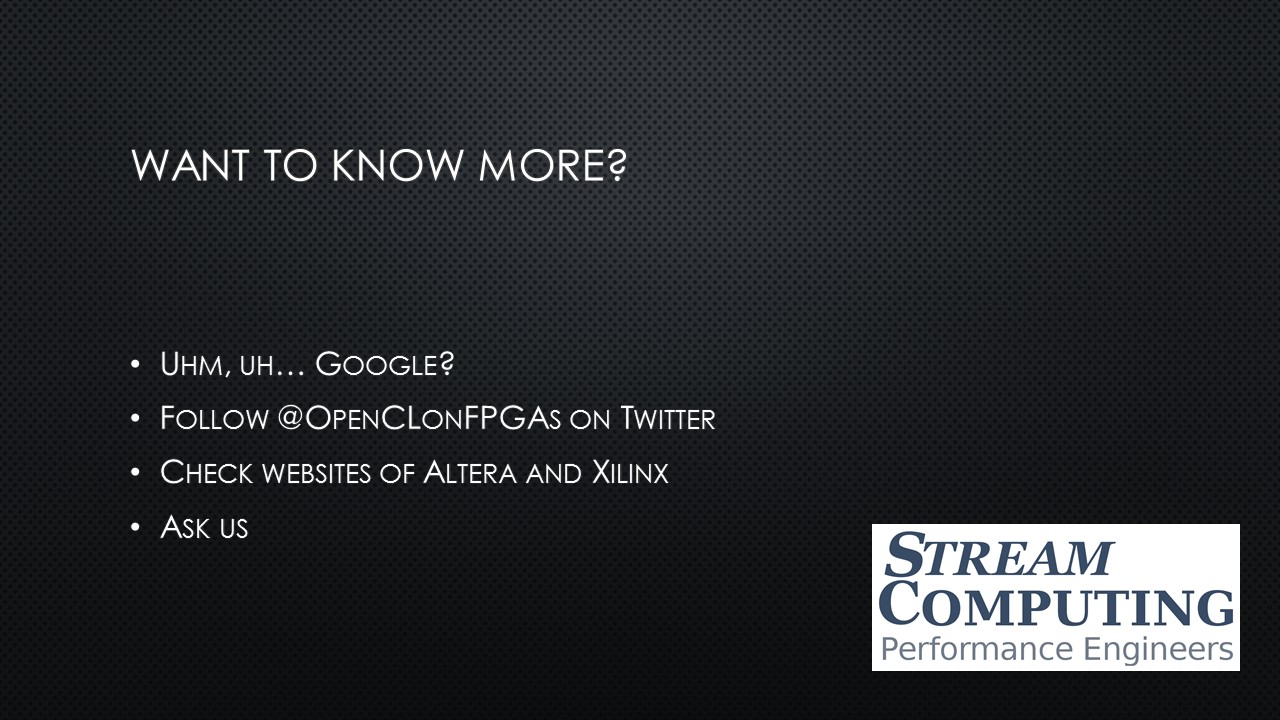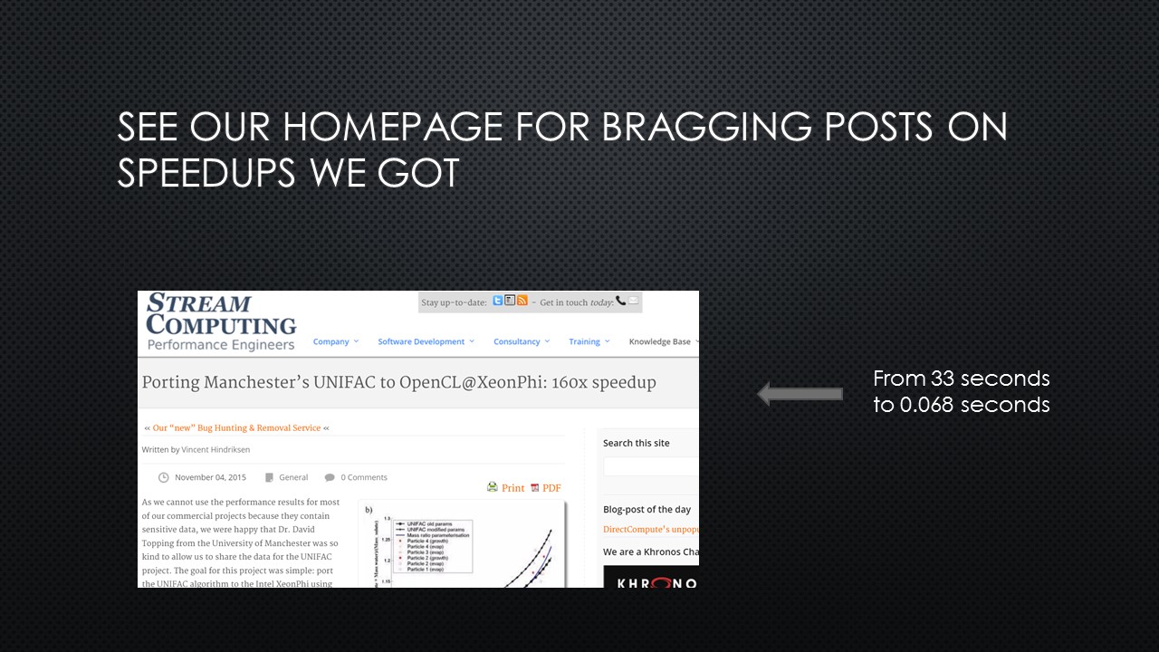 Do you want us to present OpenCL, accelerators or performance engineering in a talk tailored for your audience? Just give us a call.
